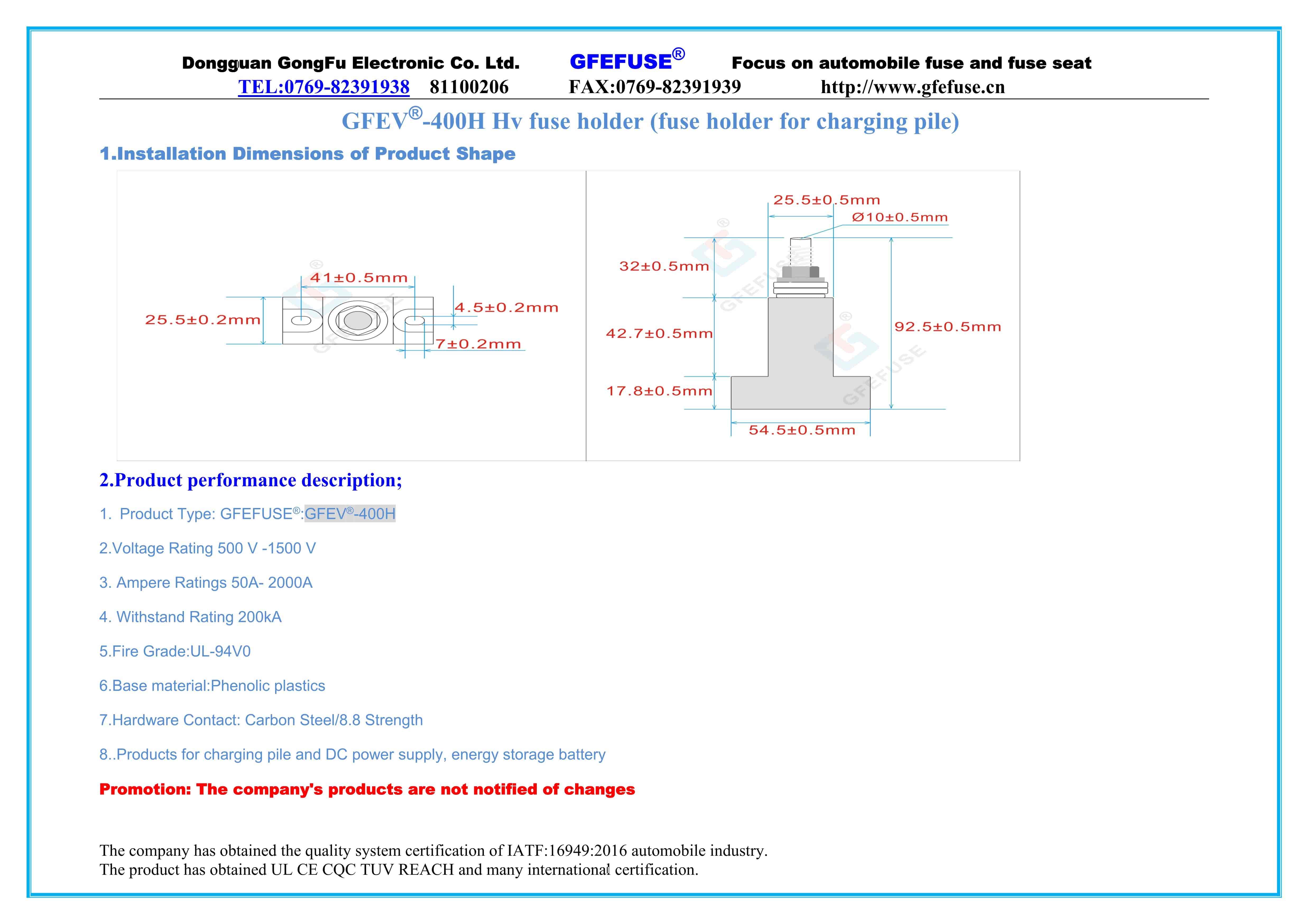 東莞市貢福電子有限公司專業(yè)制造銷售太陽能光伏熔斷器、新能源車用保險絲、微型保險絲、叉栓保險絲、汽車保險絲、高壓保險絲、貼片保險絲、陶瓷保險絲、汽車保險絲座、汽車熔斷器、突跳式溫控器、汽車過載保護(hù)器,保險絲座,汽車插片保險絲。插片保險絲座,叉栓保險絲座,叉栓保險絲盒,螺栓保險絲,螺栓保險絲座,低壓熔斷器.直流熔斷器,直流保險絲,車用保險絲,車用保險絲座等。產(chǎn)品通過UL CE CQC TUV REACH等認(rèn)證。客戶遍布廣東、江蘇、東莞、上海等全國各地。